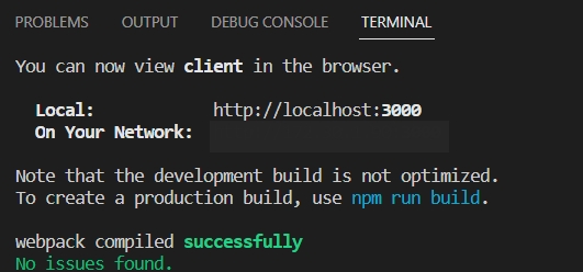 여기까지 하고 터미널에 npm run start 입력해서 웹사이트와 터미널이 아래 이미지와 동일하게 나오는지 확인!