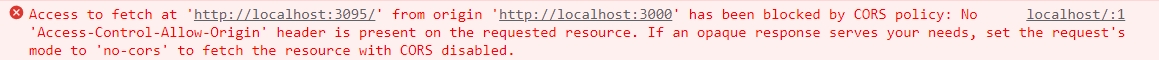 Proxy 설정을 하지 않고 client의 3000번 포트에서 server의 3095 포트로 요청을 보내면 cors 정책에 의한 아래 오류가 발생할 것이다. 더 쉽게 말하자면, aaa.com 도메인에서 bbb.com 도메인으로 무언갈 보내려고 한다면 보안적으로 막아놔야 안전하기 때문에 설정 없이는 허용하지 않기 때문이다. (네이버에서 지메일로 요청을 보낸다고 생각하면 더 쉽다.)