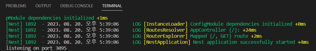 여기까지 하고 터미널에 npm run start:dev로 실행시키고 http://localhost:{지정한 포트}로 열리는지 확인!