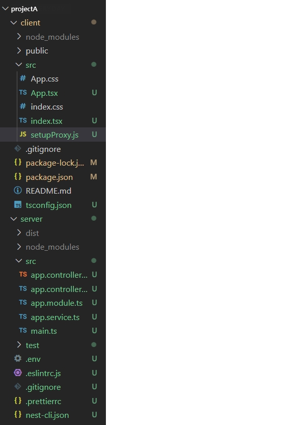 예를 들어 projectA 프로젝트 하위 폴더로 server, client를 만들었고 server에는 nestJS 설치, client에는 React를 설치했다.