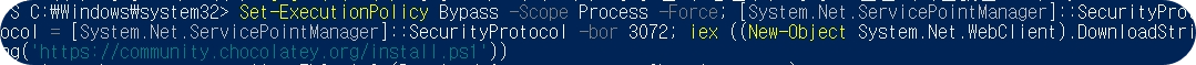Set-ExecutionPolicy Bypass -Scope Process -Force; [System.Net.ServicePointManager]::SecurityProtocol = [System.Net.ServicePointManager]::SecurityProtocol -bor 3072; iex ((New-Object System.Net.WebClient).DownloadString('https://community.chocolatey.org/install.ps1'))