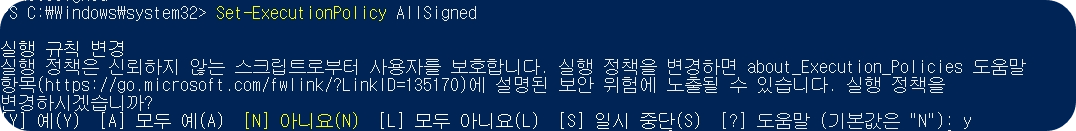 위에서 AllSigned 가 아니라면 전부 아래 명령어로 실행 정책을 변경해줘야 한다. 아래 명령어를 실행한다면 이미지처럼 긴 안내 문구들이 나오는데 y를 입력해 주면 된다. 사실 여기서부터 이거 맞아? 이러면서 또 검색을 엄청 했는데 정상적으로 나오는 안내 글이니 두려워하지 말고 y 입력해 버리자!