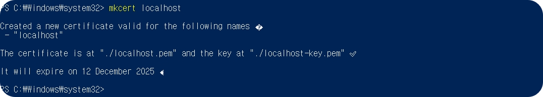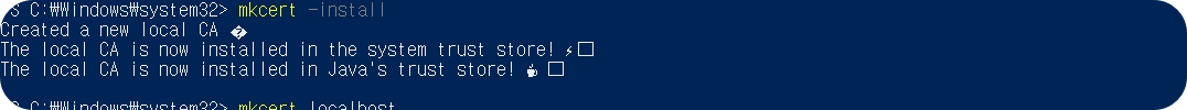 이제 mkcert까지 설치가 완료되었고 아래 명령어를 입력해서 인증서를 생성해 주자! 여기서 아마.. 팝업창이 하나 뜨는데 "예" 버튼? 만들겠다는 버튼을 클릭하면 된다. 이 부분은 캡처를 하지 못해서 연회색 팝업창만 뜬다면 무조건 예쓰!라고 생각하면 된다.