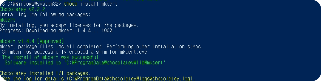 choco를 설치했다면 이제 mkcert를 설치해야 한다. 이걸 설치하기 위해 choco를 설치했으니까..! 아래 명령어가 설치하는 명령어이다.
