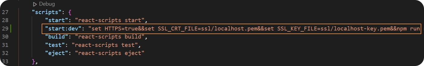 "start:dev": "set HTTPS=true&&set SSL_CRT_FILE=ssl/localhost.pem&&set SSL_KEY_FILE=ssl/localhost-key.pem&&npm run start",