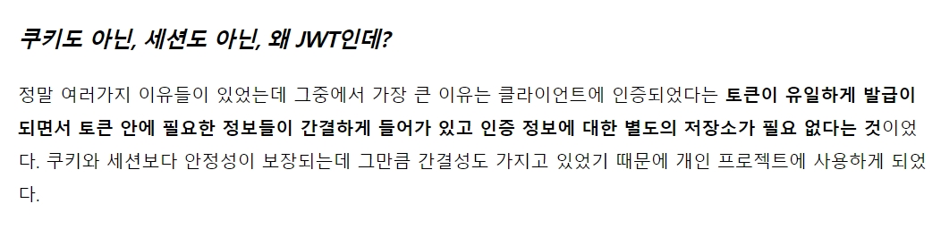 JWT... 분명 프로젝트에서 기본적으로 많이 사용했고, 과제들에서 요구사항들도 필수 요구사항이라고 할 수 있을 정도로 실무에서 JWT를 많이 사용하고 있다는 것을 알 수 있었다. 이 글을 쓰는 이유는 아래 블로그를 작성했던 것처럼 JWT에 대해서 왜 써야 하고 어디에 저장을 해야 하고 어떻게 개발을 해야 하는지에 대하여 고민했던 시절이 있었다.